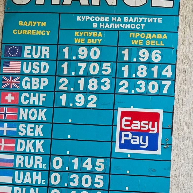 W Słonecznym Brzegu praktycznie na każdej ulicy jest kantor. Widać je co kilka metrów. Wybrać najlepiej taki gdzie na tablicy widoczna jest cena skupu i sprzedaży bez prowizji „no commission”. Skup 1,90 leva za euro i Sprzedaż 1,96 leva za euro. Kurs w Bułgarii jest zamrożony przed wejściem waluty Euro i powinien być wszędzie taki sam. Za 100 euro powinniśmy dostać 190 levów. Natomiast ceny w sklepach aby przeliczyć na złotówki mnożymy x2,20.